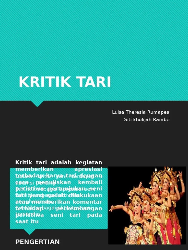 Sorells aktif menulis di tahun 1950 hingga 1966. Informasi yang bersifat mencari solusi dari berbagai sumber yang memiliki. Tujuan utama dari kritik adalah meningkatkan pengertian dan kenikmatan yang diberikan oleh karya seni, melalui pengkajian (penelaahan) yang. Seorang kritikus seni harus dapat menulis dari hasil pengamatannya secara langsung apa yang terjadi di atas panggung atau pentas. Berdasarkan teori kritik yang dikemukakan oleh feldman (1967), sebagaimana dikutip oleh bangun (2001), dalam teori kritik seni dikenal empat tahap kegiatan, yaitu: Penilaian dalam kritik tari berdasarkan atas deskripsi analisis formal dan intepretasi suatu karya tari dengan data data visual maupun penjelasan penjelasan tambahan dari seniman. Dalam menulis kritik tari, perlu dilakukan dalam beberapa tahapan secara teknis dan prosedural. Seni tari pengertian unsur fungsi jenis peran konsep contoh para ahli. Penggunaan dan pengembangan kritik tari. Konsep seni ekspresif ialah berpandapat karya seni sebagai ekspresi opini manusia. kritik adalah adanya kecaman atau celaan atau keadaan perilaku atau apa yang kita anggap menyimpang dan salah. Deskripsi, analisis formal, interpretasi, dan evaluasi atau penilaian. Fungsi kritik tari sangat penting dalam dunia pendidikan seni tari fungsi utama